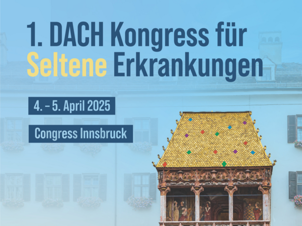 Von 4. bis 5. April 2025 findet im Congress Innsbruck der 1. DACH Kongress für Seltene Erkrankungen statt. Es ist die erste gemeinsame Fachtagung deutschsprachiger Länder zu Seltenen Krankheiten - mit dem Ziel, die verschiedenen Aktivitäten zum Thema in den drei Ländern Deutschland, Österreich und Schweiz (DACH-Region) zu vernetzen und zu stärken.