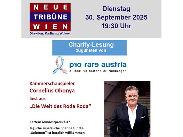 Erleben Sie Cornelius Obonya live bei der großen Charity-Lesung zugunsten von Pro Rare Austria im Theater „Die Neue Tribüne Wien“ im Café Landtmann!